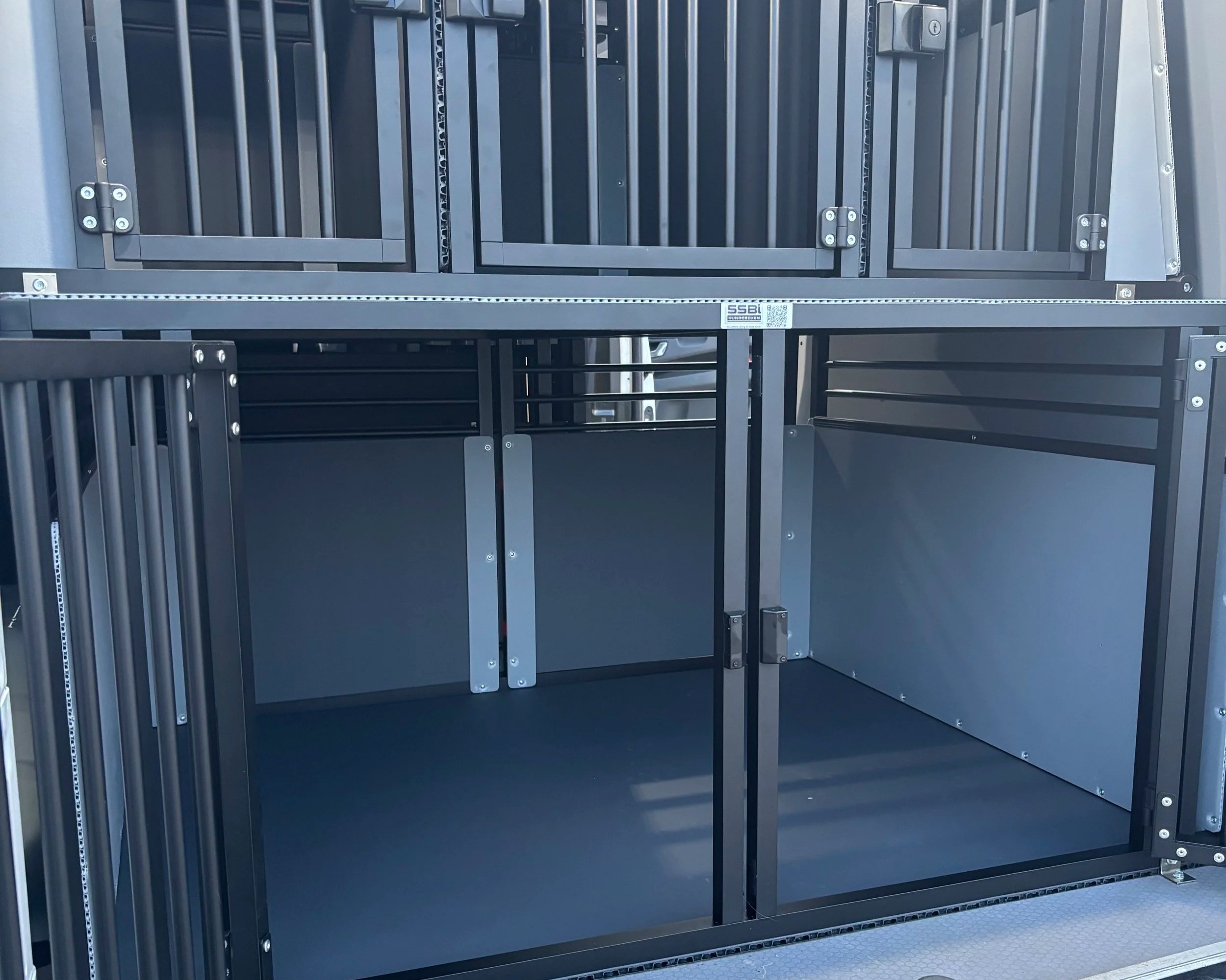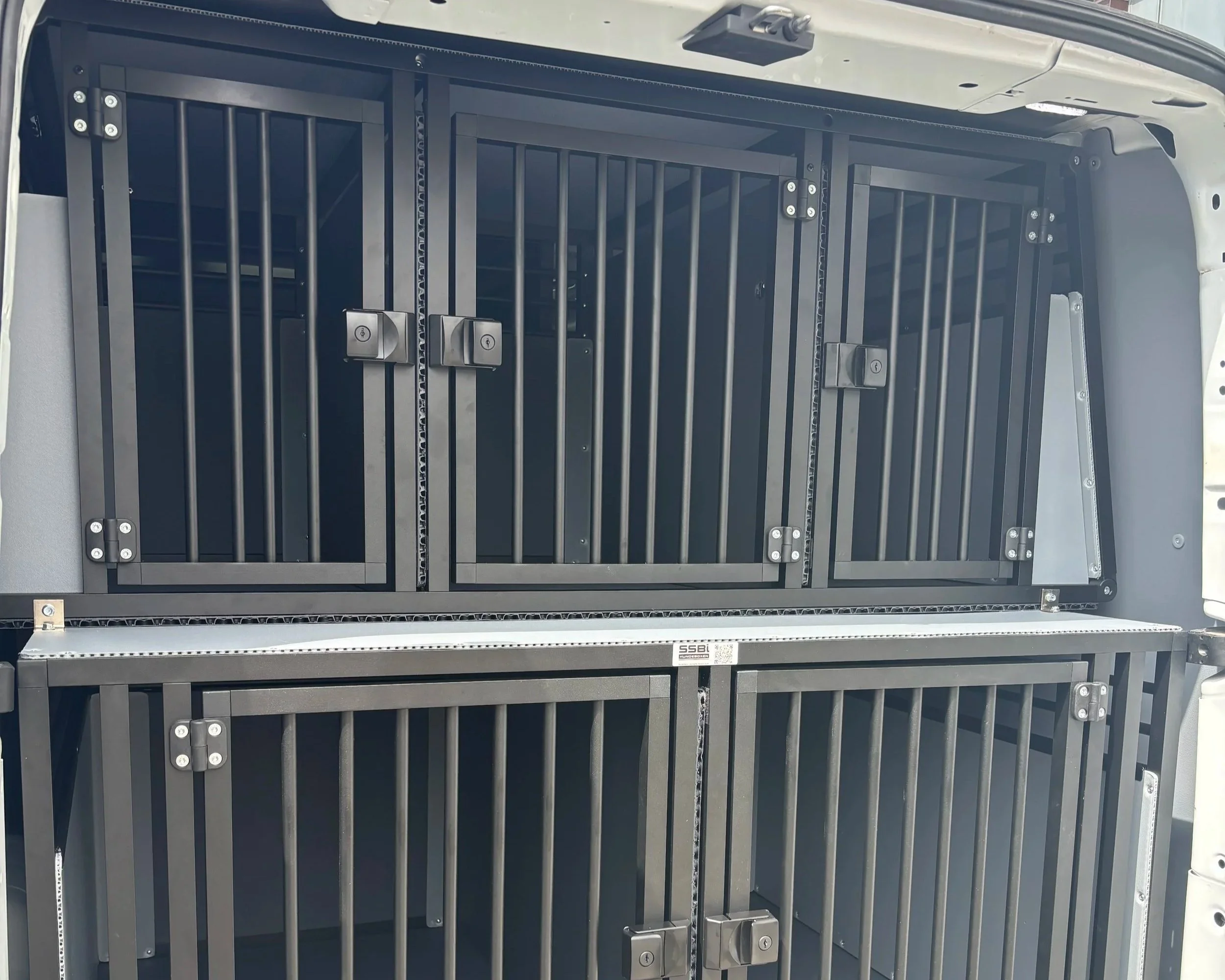 Im Fahrzeug befinden sich maßgefertigte Hundeboxen in verschiedenen Größen. Insgesamt stehen bis zu 11 sichere Boxen zur Verfügung. Jede Box bietet: